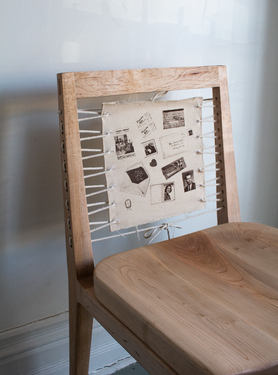Memorial chair is one of the first attempts I've made at combining my design practice with my craft and woodworking practice. I wanted to force myself to link the work I've made addressing family and paper ephemera and grief to something like making a piece of hardwood furniture. I'm interested in exploring the through line of labor that connects fine woodworking with the lengthy processes of scanning and digitizing ephemera and with the extensive caretaking that a family member often needs. The functional objects that we live alongside or the ones that my grandparents lived alongside store endless memories and immense sentimental value. In my work, I am honoring these objects, and I am honoring both the memories that I share with my family and the memories that preceded my own. I made a chair, simple enough in its form that it could be tucked under any kitchen table. The screenprint on the canvas depicts multiple scanned objects like ticket stubs and envelopes, objects my grandmother had kept from her time in high school and college.